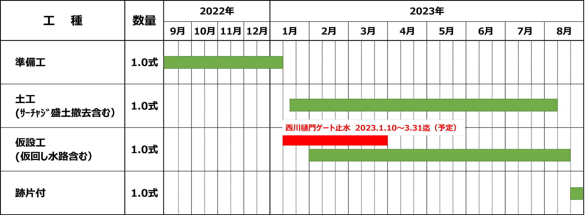 仮設工(仮回し水路)を行うにあたり、西川樋門ゲートの止水を (2023.1.10~3.31迄予定)行います。