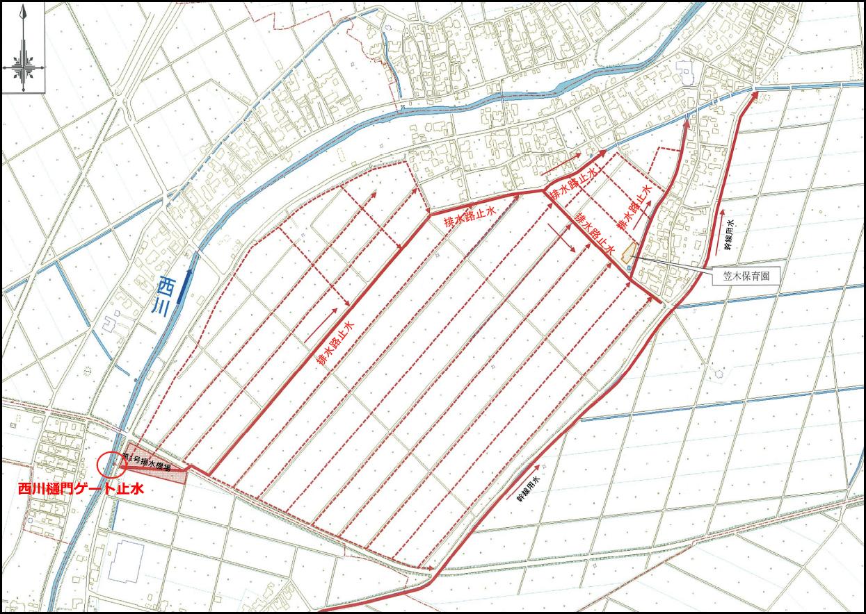 | 作業内容 | 仮設工(仮回し水路)のための西川樋門ゲート止水 |